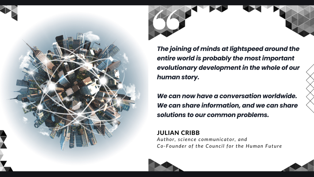 JC: The joining of minds at lightspeed around the entire world is probably the most important evolutionary development in the whole of our human story. We can now have a conversation worldwide. We can share information, and we can share solutions to our common problems. Now, we can rely on the internet, social media, and our ability to communicate with one another, one-on-one or in groups, to find common purpose. Basically, we must get past our tribalism; to forget that we come from separate nations or groups or cultural identities. We must come to understand that we share a common fate. We are all bound together, one humanity on one planet. We need to develop one mind to become a species that thinks together about its future and thinks about how together we can secure that future.
